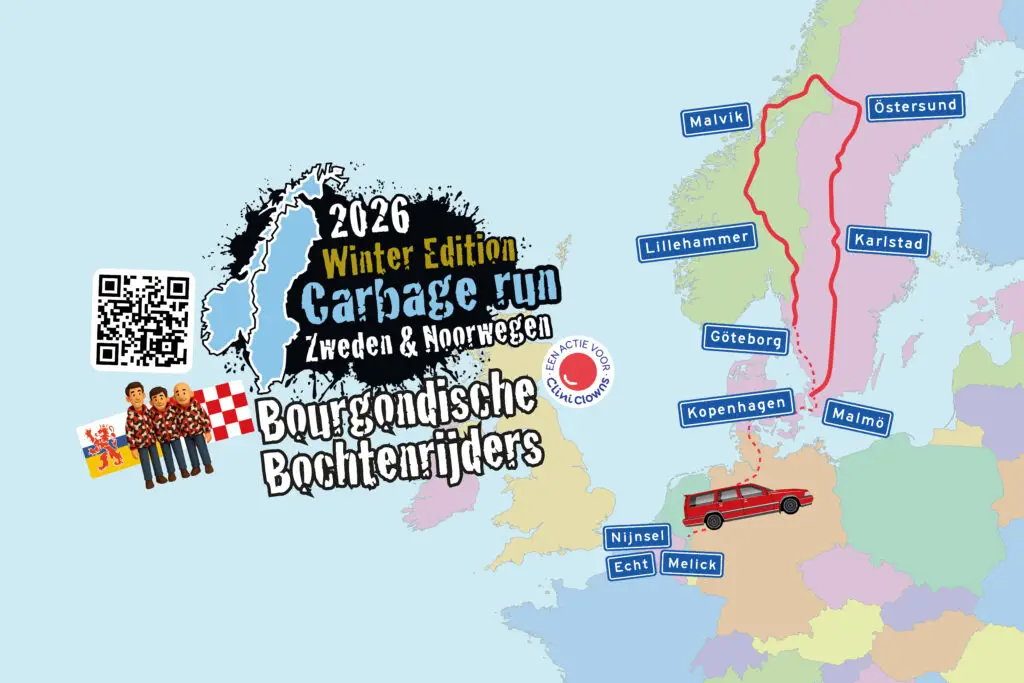 Van 26 tot en met 30 januari 2026 gaan wij (Roel, Maarten en Thomas) als team ‘Bourgondische Bochtenrijders‘ samen op avontuur tijdens de Carbage run Wintereditie 2026 Zweden & Noorwegen: een vijfdaagse tocht vol uitdagingen door het besneeuwde Scandinavië. In een Volvo V70 van 20 jaar oud en met een dagwaarde van maximaal €1.000,-.